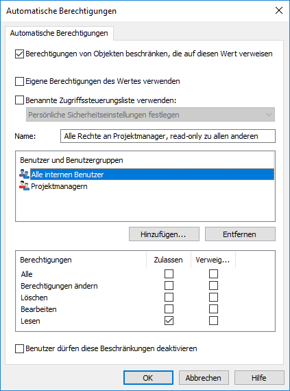 Aktivieren Sie die Funktion Berechtigungen von Objekten beschränken, die auf diesen Wert verweisen, wenn Sie die automatischen Berechtigungen aktivieren möchten.