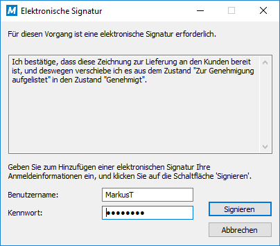 In der Darstellung hat der Benutzer diese Signaturbedeutung definiert: „Durch Verschieben dieser Zeichnung vom Status %SIGNED_FROM_STATE% in %SIGNED_TO_STATE% bestätige ich, dass die Zeichnung damit bereit zur Auslieferung an den Kunden ist.“