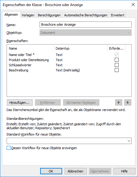 Durch Benutzen der Eigenschaften Tabelle können Sie definieren, welche Eigenschaften automatisch zum Metadatenformular hinzugefügt werden, wenn diese Klasse ausgewählt wird.