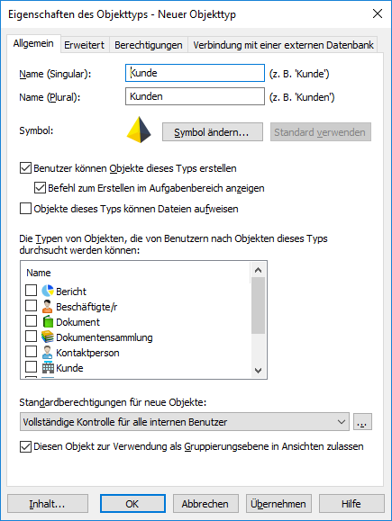 Für weitere Anleitungen, siehe Erweiterte Eigenschaften des Objekttyps.