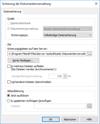 - Jetzt ausführen, um umgehend eine Datensicherung durchzuführen.