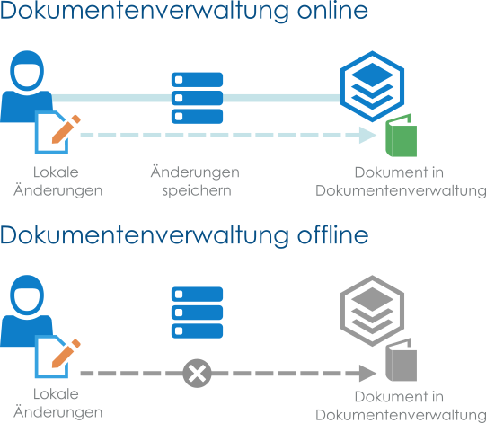 Wenn eine Dokumentenverwaltung offline geschaltet wird, werden die Benutzersitzungen unterbrochen. Falls ein Benutzer ein Dokument zur Bearbeitung auscheckt und Änderungen am Inhalt vornimmt, während der Administrator der Dokumentenverwaltung diese offline schaltet, kann der Benutzer in der Folge das Dokument solange nicht einchecken, bis die Dokumentenverwaltung erneut online geschaltet ist. Es wird deshalb nicht empfohlen, unplanmäßige Arbeiten durchzuführen, die ein Offlineschalten der Dokumentenverwaltung erfordert.Offline-Schaltung einer Dokumentenverwaltung