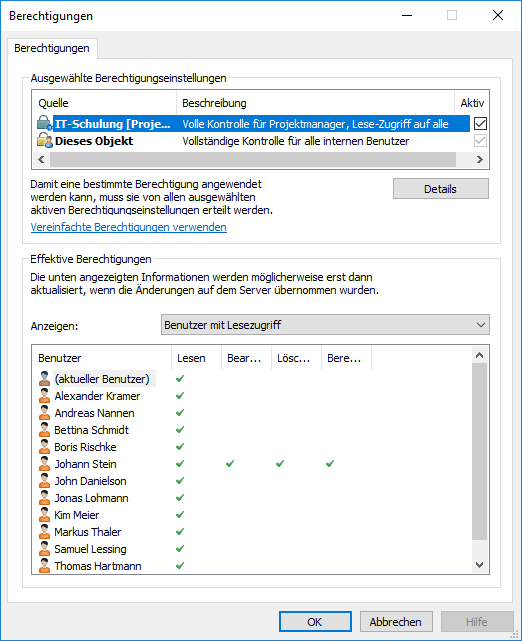 Der für das Objekt selbst festgelegte Zugriff kann den Vollzugriff auf das Dokument für alle Benutzer umfassen, während die automatischen, über ein Projekt zugewiesenen Berechtigungen die Verwendung des Dokuments in der Weise einschränken können, dass nur Projektleitern der Vollzugriff gewährt wird und alle anderen Benutzer nur schreibgeschützten Zugriff haben.