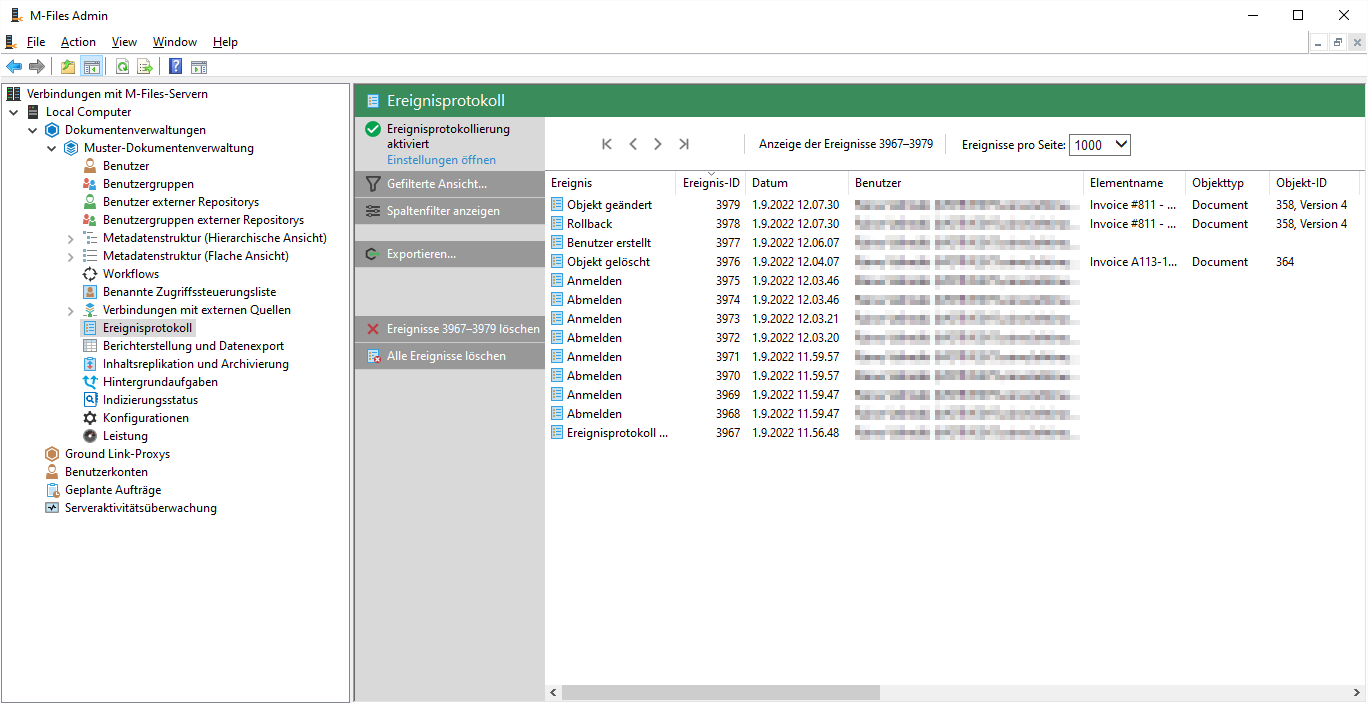 In diesem Abschnitt wird beschrieben, welche Funktionen im Ereignisprotokoll der Dokumentenverwaltung zur Verfügung stehen und wie Sie diese nutzen können. Um das Ereignisprotokoll zu öffnen, wechseln Sie in M-Files Admin zu einer Dokumentenverwaltung, und wählen Sie Ereignisprotokoll.