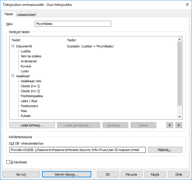 Anna OLE DB -yhteysmääritys -kenttään yhteysmerkkijono kohdetietokantayhteyden muodostamista varten tai määritä yhteysmerkkijono valitsemalla Määritä.