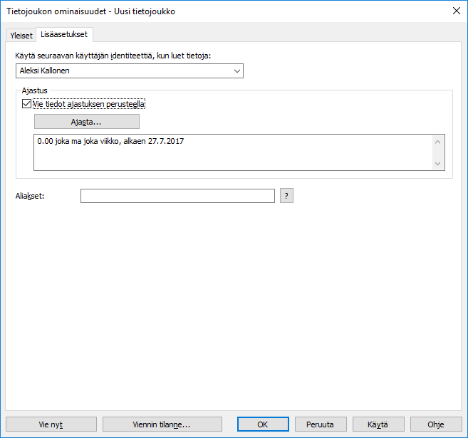 Lisäasetukset-välilehdellä voit määrittää tietojoukolle aliaksen.
