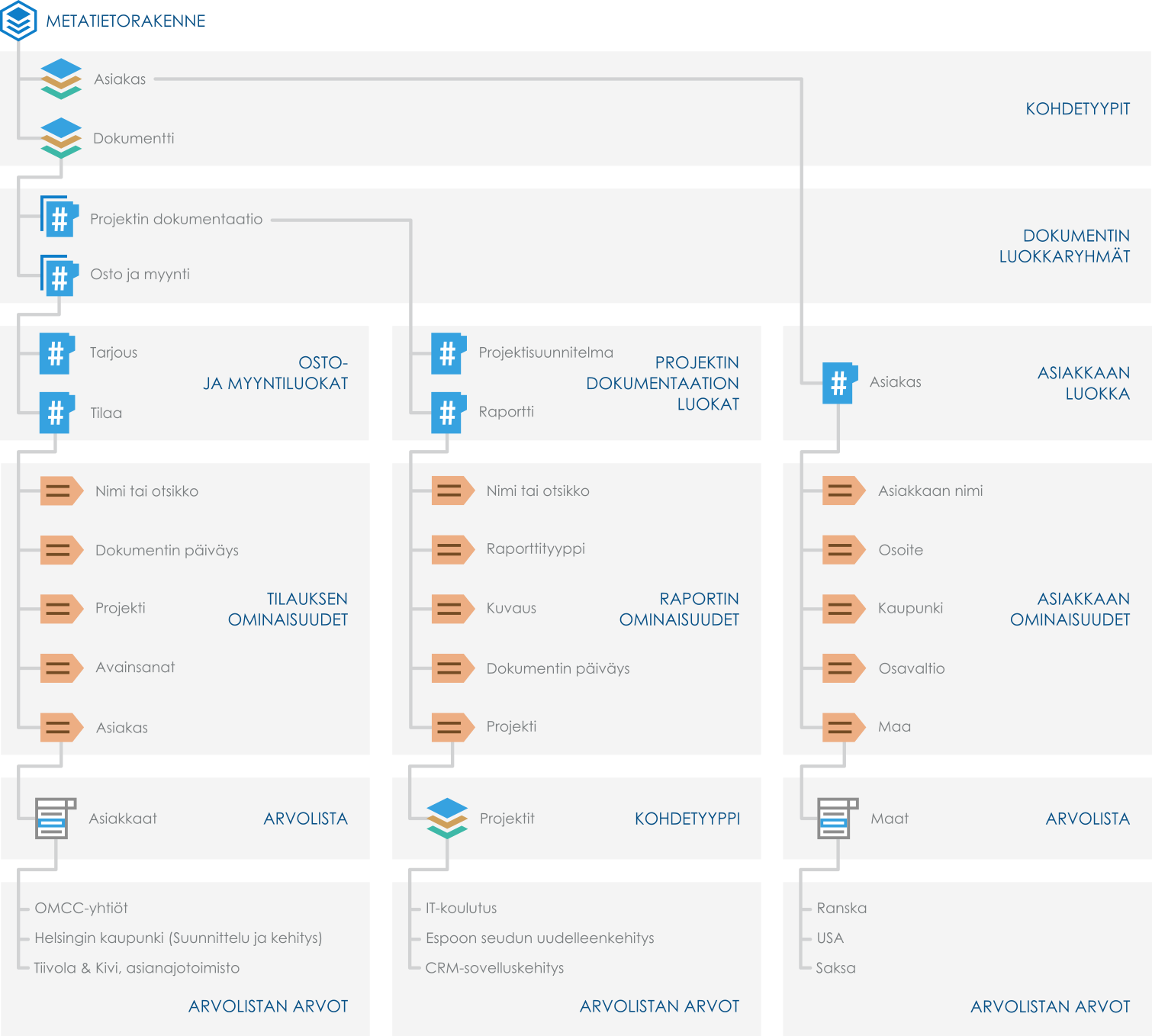 M-Files Adminin avulla voit muokata varaston metatietoelementtejä, kuten kohdetyyppejä, arvolistoja, ominaisuusmäärittelyitä ja luokkia. Luokat voidaan myös luokitella edelleen luokkaryhmiksi. Dokumentin ja kohteen metatietoja käytetään melkein kaikkialla M-Filesissa, kuten näkymissä ja hakutoiminnoissa, joten siksi varaston metatietorakenne olisi suunniteltava huolellisesti. Varaston metatietorakenne koostuu kohdetyypeistä, luokkaryhmistä, luokista, ominaisuusmäärittelyistä ja arvolistoista. Yllä oleva esimerkki esittelee metatietorakenteen hierarkiaa, jossa rakenteeseen sisältyy Asiakas- ja Dokumentti-kohdetyypit ja näiden kahden kohdetyypin eri luokat.