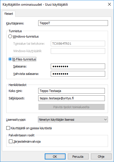 Nimetyn käyttäjän lisenssit ovat käyttäjätilikohtaisia. Tällä käyttäjätilillä voidaan lisenssin puolesta aina käyttää M-Filesia, riippumatta muista käyttäjistä.