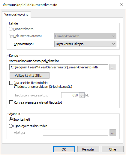- Suorita heti, jos haluat käynnistää varmuuskopiotyön heti.