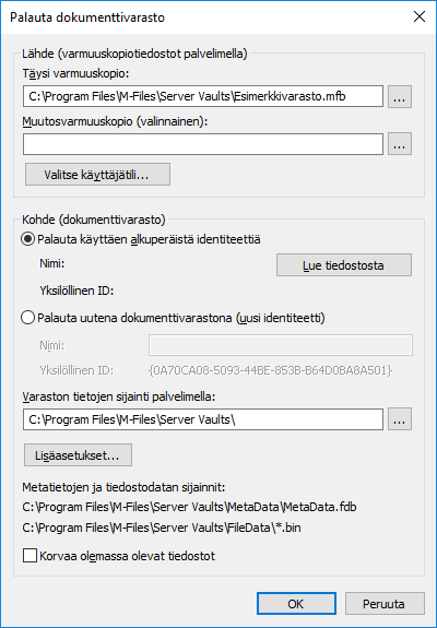 - Palauta käyttäen alkuperäistä identiteettiä: Valitse tämä, jos haluat käyttää dokumenttivaraston nykyistä ID:tä.tai