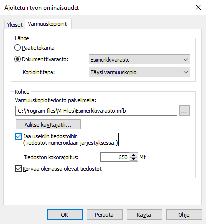 Ajoitetun työn ominaisuudet -ikkunan Varmuuskopiointi-välilehdellä voit määrittää varmuuskopioitavan sisällön ja varmuuskopioinnin kohteen. Voit myös määrittää, jaetaanko varmuuskopio useisiin tiedostoihin ja korvataanko olemassa olevat varmuuskopiotiedostot.