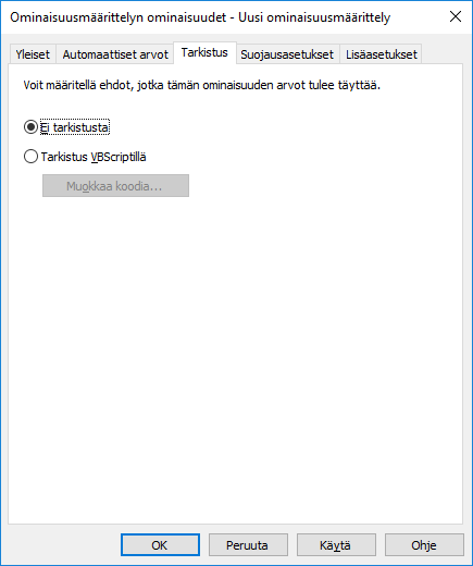 Kirjoita Muokkaa VBScript-koodia -ikkunaan VBScript-koodia tämän ominaisuuden arvojen tarkistusta varten.
