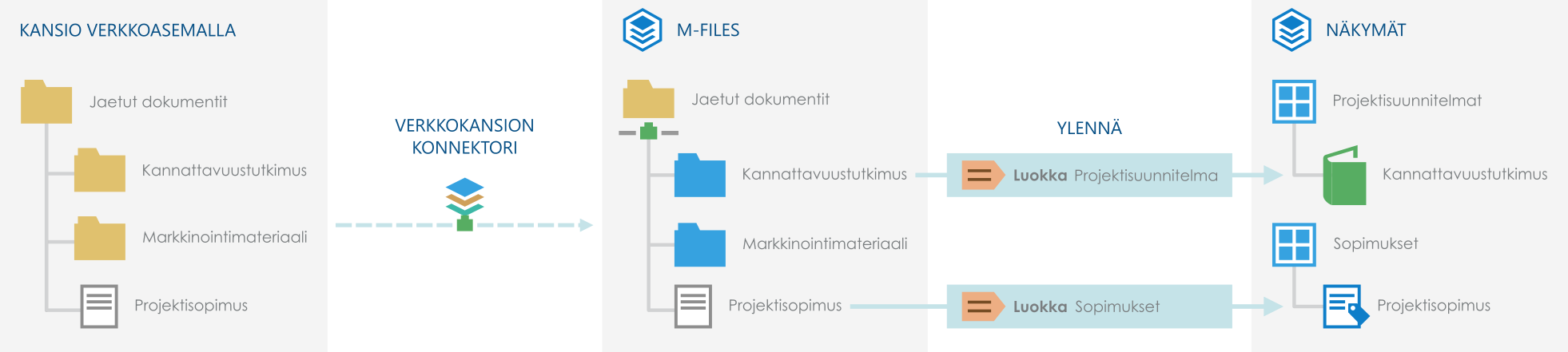 Konnektorien avulla voit integroida M-Filesin ulkoisten tietovarastojen kanssa niin, että voit näyttää ja muokata ulkoisten tietovarastojen sisältöä M-Filesissa. Lisäämällä metatietoja voit muuttaa ulkoisten tietovarastojen tiedostoja ja kansioita M-Files-kohteiksi niin, että ne voidaan järjestää esimerkiksi metatieto-ohjatuiksi näkymiksi.Ulkoisten tietovarastojen kohteet ovat oletusarvoisesti ei-hallittuja mutta ne voidaan muuttaa hallituiksi kohteiksi. Katso lisätietoja kohdista Ei-hallitut ja hallitut kohteet ja Ei-hallittujen kohteiden muuttaminen.