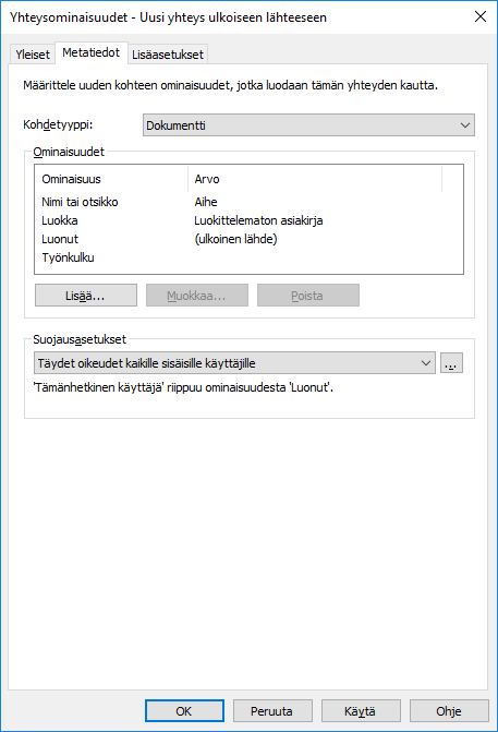 Valitse Suojausasetukset-pudotusvalikosta suojausasetukset tämän yhteyden kautta luoduille uusille kohteille.