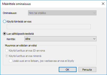 - Lue sähköpostiviestistä: Käytä tätä vaihtoehtoa, jos haluat poimia valitulle ominaisuudelle jonkin arvon sähköpostiviestistä.Huomaa: Jos valitset ominaisuuden arvon lähteeksi Päiväys-kentän, ominaisuuden tietotyypin on oltava Aika. Ei ole suositeltavaa valita Aikaleima-tietotyypin ominaisuutta Päiväys-kenttään, koska Aikaleima-arvot säädetään asiakaskoneiden aikavyöhykeasetusten mukaan.
