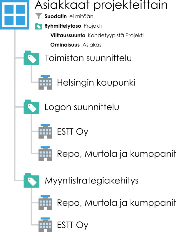 Sanotaan, että haluat vaikka luoda näkymän, joka sisältää asiakkaiden mukaan ryhmitellyt projektit. Tässä tapauksessa suodattaisit näkymän Projekti-kohdetyypin avulla ja lisäisit Asiakas-kohdetyypin ryhmittelytasoksi viittaussuunnan valinnalla Kohdetyyppiin Asiakas, koska näkymän Projekti-kohteet viittaavat näkymän ryhmittelyyn käytetyn kohdetyypin suuntaan (Asiakas).