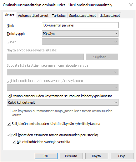Tavoite Toimenpiteet Automaattisen kasvavan numeroinnin määritys ominaisuudelle. Valitse Juokseva numerointi -vaihtoehto ja määritä jokaisen uuden arvon lisäyksen määrä Lisäys-kenttään. Muokatun automaattisen numeroinnin määritys ominaisuudelle käyttämällä toimintoa VBScript. Valitse Mukautettu automaattinen numerointi (VBScript) -vaihtoehto ja napsauta Muokkaa koodia..., jotta voit lisätä koodin automaattiselle numeroinnille. Huomaa: Katso lisätietoja kohdasta Automaattisen ominaisuusarvon määritys VBScriptin avulla.Tekstin ja ominaisuuden paikkamerkkien yhdistelmän määritys automaattiseksi ominaisuuden arvoksi. Valitse vaihtoehto Ominaisuuksien liittäminen yhteen ja anna tekstin ja ominaisuuden paikkamerkkien yhdistelmä tekstikenttään. Voit lisätä ominaisuuden paikkamerkkejä napsauttamalla Lisää paikkamerkki... -painiketta. Huomaa: Katso lisätietoja paikkamerkeistä kohdasta Ominaisuuksien liittäminen yhteen.Ominaisuuden määritys automaattisesti lasketulle arvolle toiminnolla VBScript. Valitse Laskettu arvo (VBScript) -vaihtoehto ja napsauta Muokkaa koodia... lisätäksesi koodin ominaisuuden arvon laskemista varten. Huomaa: Katso lisätietoja kohdasta Automaattisen ominaisuusarvon määritys VBScriptin avulla. - Valinnainen: Anna Viimeksi käytetty arvo -kenttään automaattisen numeroinnin alkuarvo, jos haluat käyttää jotakin muuta arvoa kuin oletuksena olevaa nollaa (0).