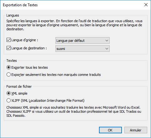 Sélectionnez XML simple si vous souhaitez traduire les segments dans Microsoft Word ou Excel. Sélectionnez XLIFF si vous souhaitez utiliser un outil de traduction professionnel comme SDL Trados ou SDL Passolo.