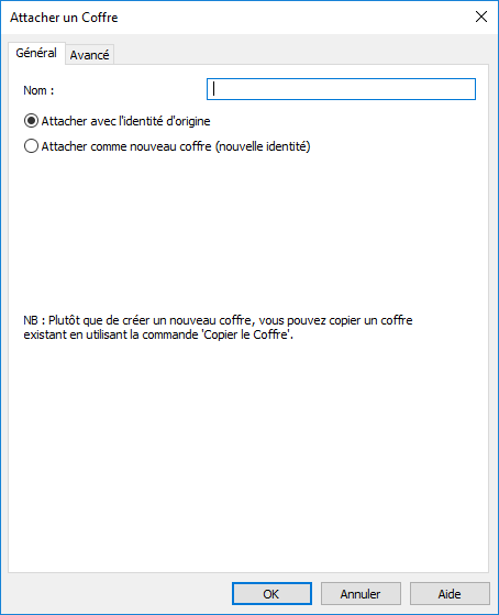 Résultat :La boîte de dialogue Options pour Attacher un Coffre s'ouvre.