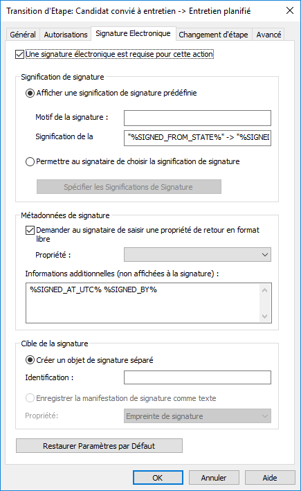 Vous pouvez demander aux utilisateurs de fournir leur signature électronique avant d’effectuer une transition d’étape spécifique dans un workflow.Le module Electronic Signatures and Advanced Logging est disponible à un tarif spécifique. Ce module comprend des extensions de journalisation des événements et la fonctionnalité de signature électronique. Pour davantage d'informations, veuillez vous reporter à Signature Electronique et conformité.