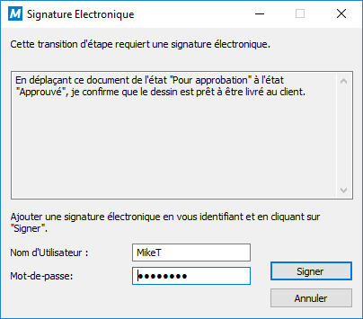 Lorsque vous définissez une signature électronique pour une transition d’étape, M-Files exige la signature pour effectuer le changement d'étape. L’utilisateur doit saisir ses données d’identification et se connecter pour ajouter la signature électronique. L'état change lorsque l'objet est enregistré.