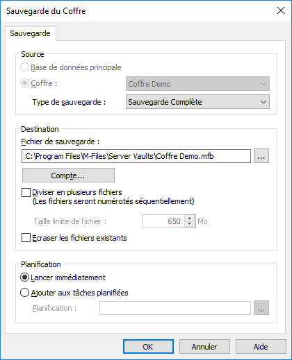 La fonction de sauvegarde de coffre peut être utilisée pour la sauvegarde d'un coffre local ou pour la planification d’une tâche de sauvegarde de coffre récurrente. Pour davantage d'informations sur les tâches planifiées, veuillez vous reporter à la section Nouvelles tâches planifiées de sauvegarde.