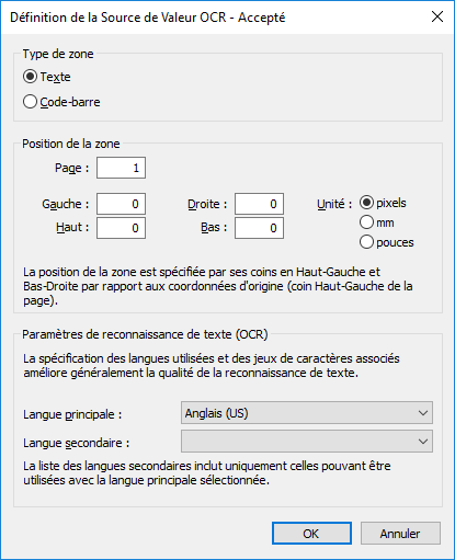 - Cliquez sur OK pour fermer la boîte de dialogue Définition d'une source de valeur OCR.