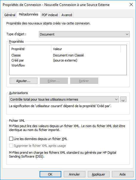 - Cliquez sur Ajouter... pour définir une nouvelle propriété et valeur à ajouter automatiquement aux objets créés à partir de fichiers externes ou sélectionnez l’une des propriétés existantes et cliquez sur Editer... pour modifier la propriété existante.