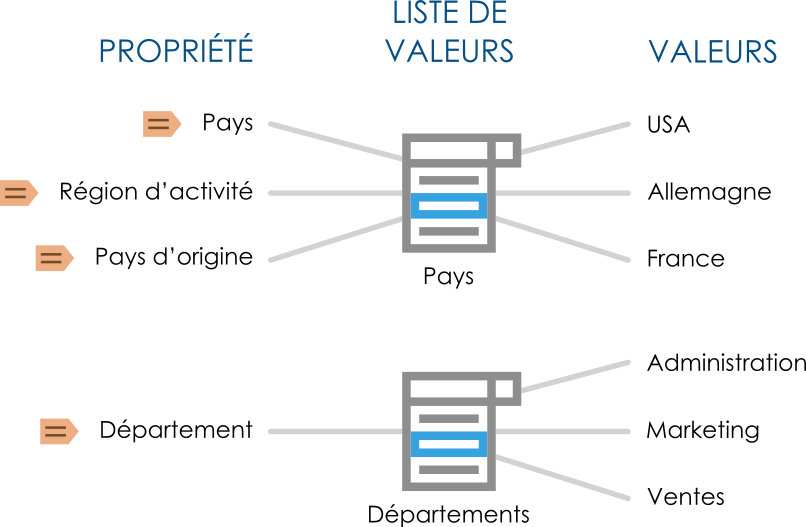 Une liste de valeurs contient diverses valeurs, comme des noms de ville. La même liste de valeurs peut être utilisée dans plusieurs propriétés différentes.