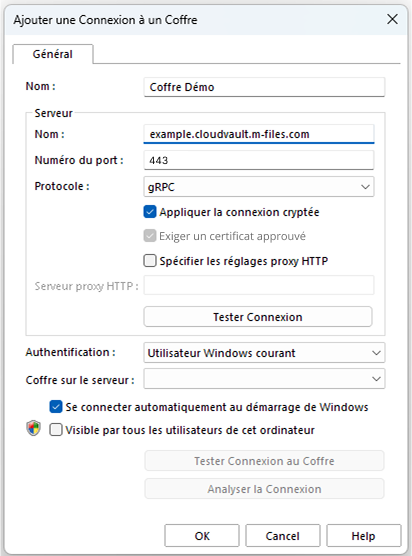 Spécifiez le mode d'authentification de l'utilisateur que le coffre doit utiliser. Les options d'authentification sont Utilisateur Windows courant, Utilisateur Windows spécifique et M-FilesUtilisateur .