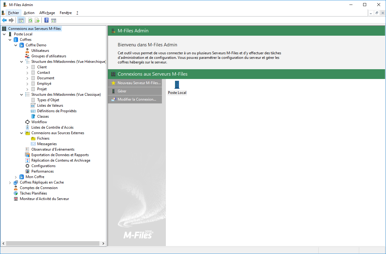 M-Files Admin est un outil qui sert à gérer et maintenir les coffres M-Files et les connexions M-Files Server.