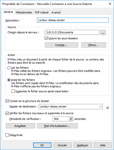 Sélectionnez la case Vérifier les fichiers nouveaux et supprimés à la source si vous souhaitez que M-Files vérifie automatiquement le dossier source à des intervalles prédéfinis et se mette à jour par lui-même en fonction des fichiers et dossiers nouveaux et supprimés. L’activation de cette option rend toute modification effectuée dans le dossier source automatiquement visible dans M-Files également.