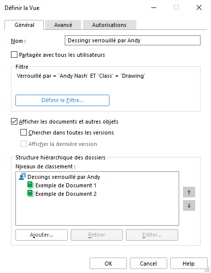 Dans l'exemple ci-dessus, les documents doivent être verrouillés par l'utilisateur Andy Nash, ils ne doivent pas avoir été supprimés et doivent appartenir au type Dessin. Aucune propriété n'a été ajoutée dans la zone Hiérarchie dans cet exemple, donc tous les documents qui remplissent les conditions seront affichés dans une liste unique.
