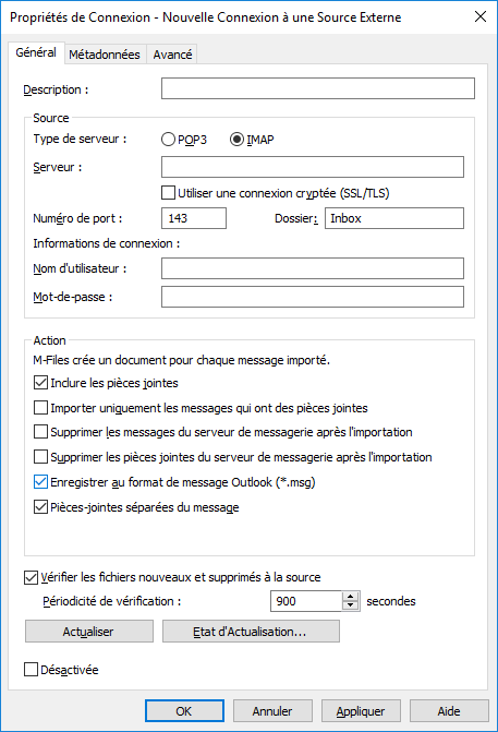 Vous pouvez définir des métadonnées automatiques pour de nouveaux objets créés à partir d’une messagerie externe. Vous pouvez utiliser des valeurs de propriétés fixes ou extraire des valeurs de propriétés des messages électroniques importés.