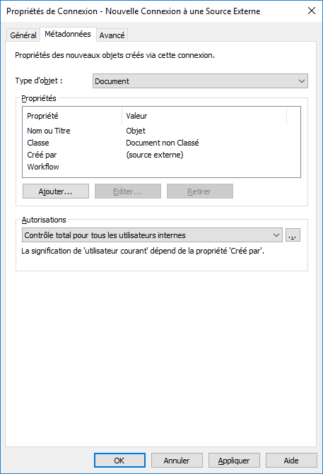 - Dans la rubrique Propriétés, cliquez sur Ajouter... pour ajouter une nouvelle propriété automatique pour les objets créés par le biais de cette connexion ou sélectionnez l’une des propriétés existantes et cliquez sur Éditer... pour la modifier.
