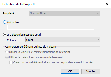 Si la propriété sélectionnée est du type de donnée Choisir dans la liste, sélectionnez, dans la rubrique Conversion en élément de liste de valeurs :