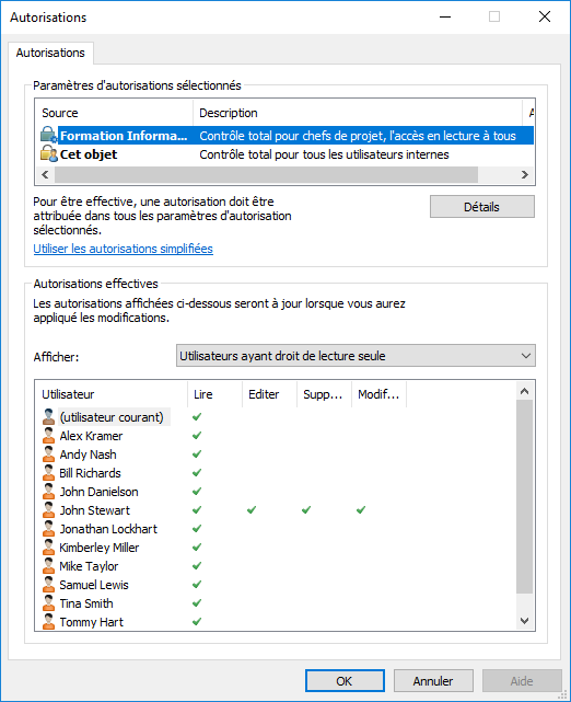 - Par sa classe, l'objet s'est vu attribuer des autorisations concédant le contrôle total à la direction et un accès en lecture seule à tous les autres utilisateurs.