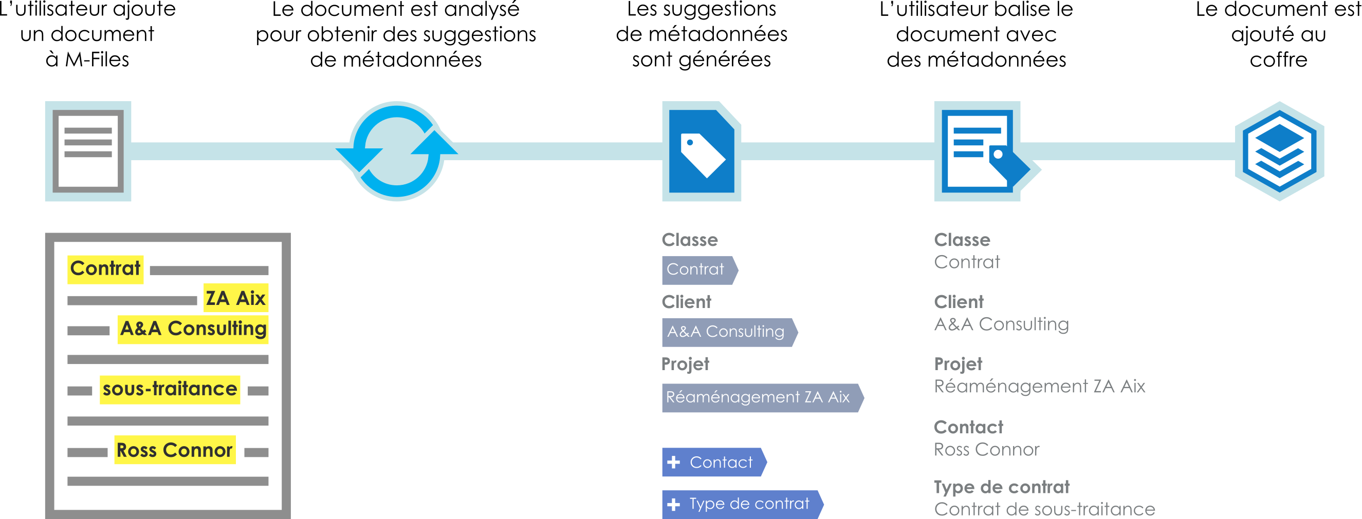 Si, par exemple, vous ajoutez un contrat dans M-Files, le service intelligent peut suggérer automatiquement le contrat à utiliser en tant que classe de document et proposer des valeurs pour les données du client et du contact, parmi d’autres champs de métadonnées, en déduisant les informations du contenu du fichier. Les utilisateurs peuvent ensuite ajouter les valeurs suggérées qui leur semblent convenir. Ce type d’automatisation peut accélérer considérablement le processus consistant à ajouter des métadonnées aux objets M-Files.