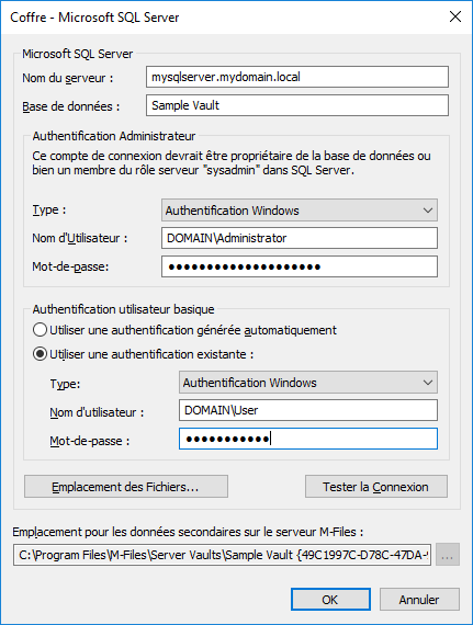 - De retour dans M-Files Admin et dans la boîte de dialogue Coffre - Microsoft SQL Server, saisissez les identifiants de l’utilisateur A dans la rubrique Authentification Administrateur.