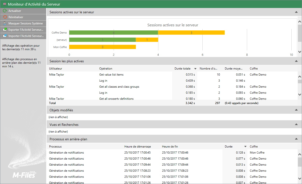 M-Files Admin comprend un outil dénommé Moniteur d'Activité du Serveur qui permet d’observer les événements, processus et tâches réalisés par les utilisateurs du coffre ou par M-Files Server. L’outil vous permet d’identifier facilement les éventuels problèmes associés aux opérations ayant lieu sur le serveur.