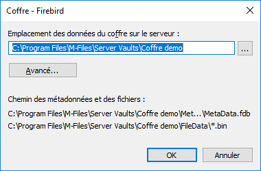 Veuillez noter que l’emplacement sélectionné doit se trouver sur le disque local de l’ordinateur M-Files Server et doit contenir les dossiers FileData et MetaData.