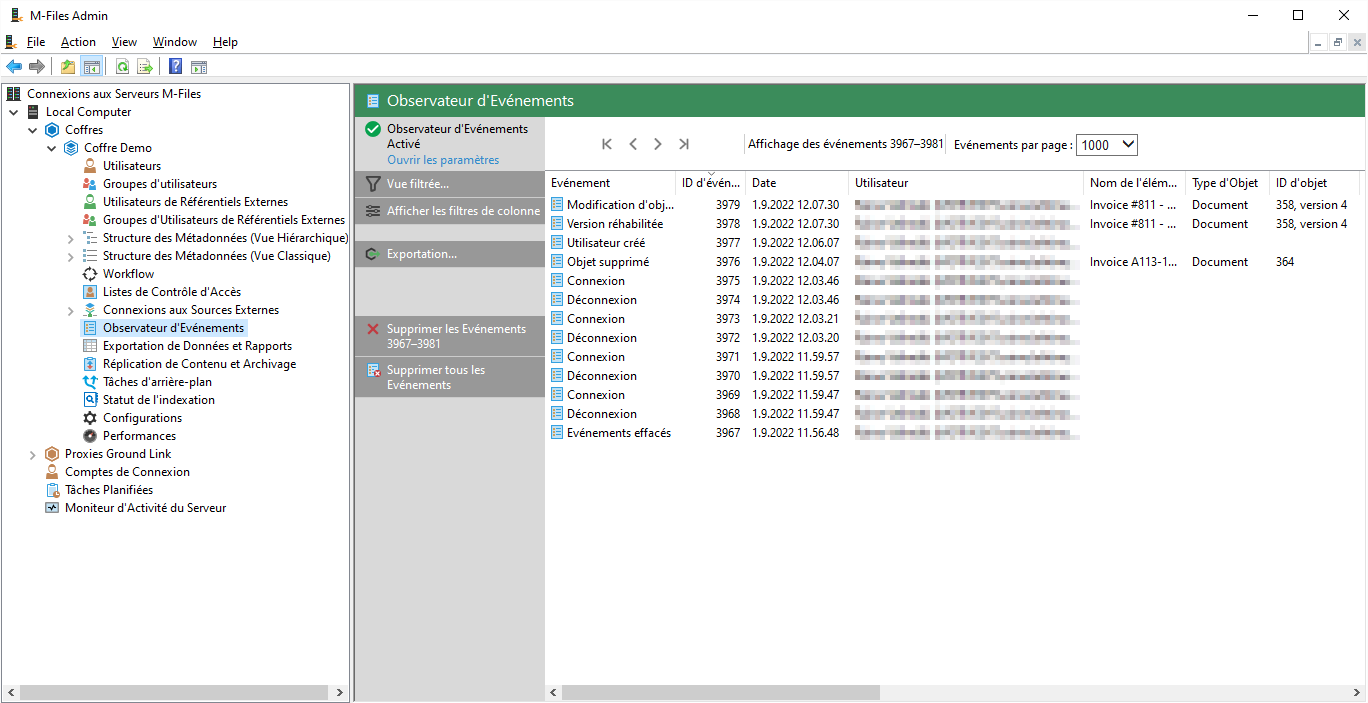 Cette rubrique vous indique quelles fonctions sont disponibles dans l'observateur d'événements du coffre et comment les utiliser. Pour ouvrir l'observateur d'événements, dans M-Files Admin, accédez à un coffre puis sélectionnez Observateur d'Evénements.