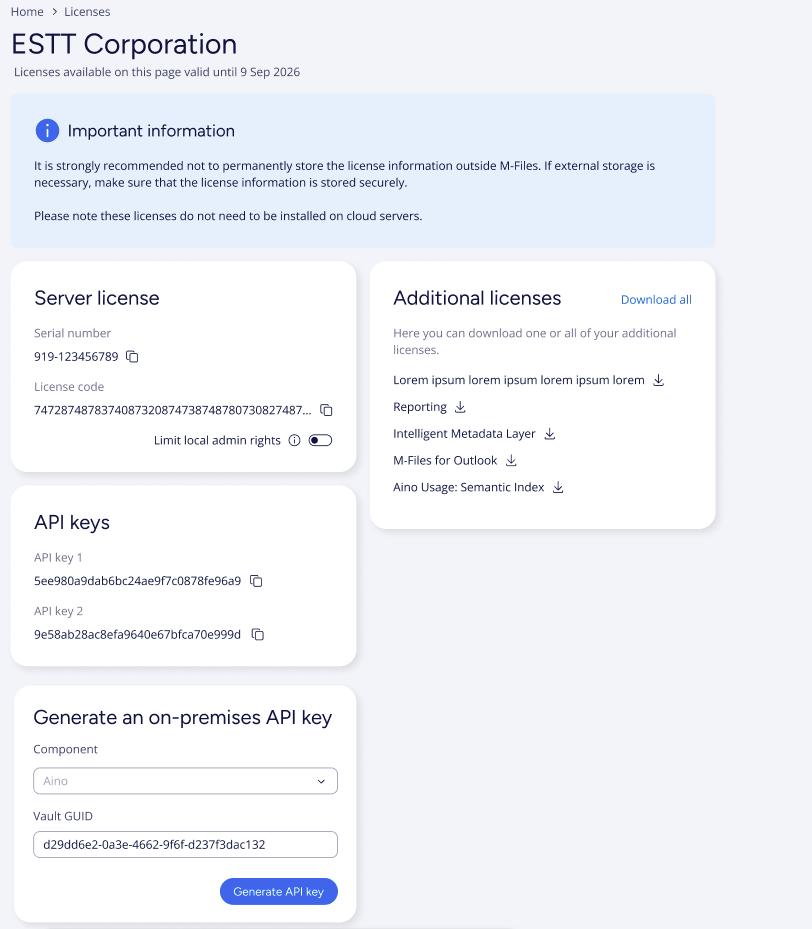 Outside of M-Files Cloud, you must install the server license yourself in M-Files Admin with the license information shown in the Server license section. For instructions, refer to the M-Files user guide.