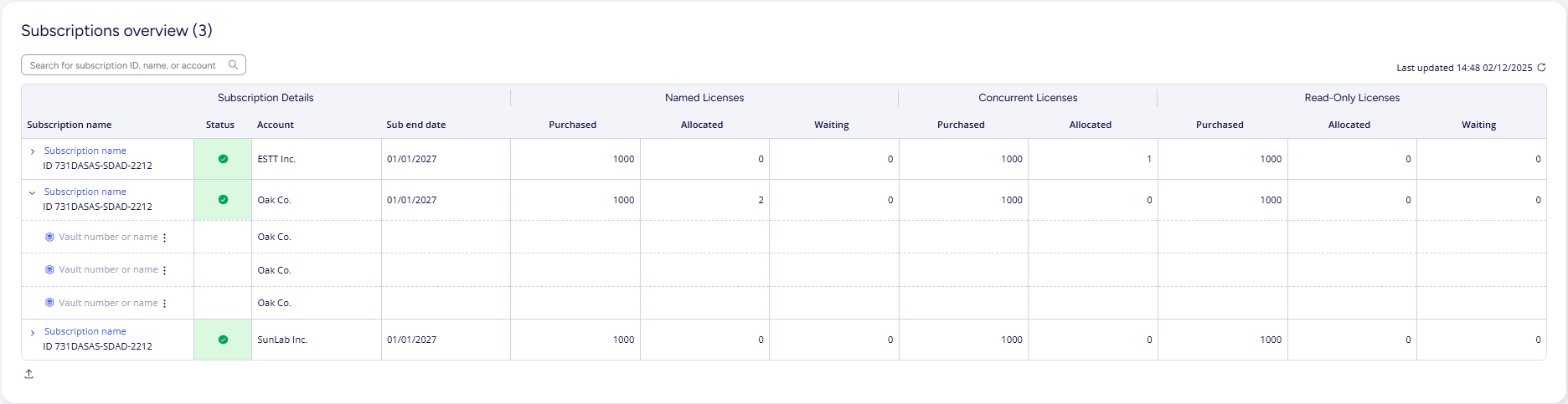 To add another customer to your Partner Cloud instance, make a Cloud Service request. After the request is processed, the subscriptions and vaults added appear in the Service Overview page. Service admins can then gain access to them through this page. On the Service Overview, you can view a list of all vaults added to your Partner Cloud under each subscription.
