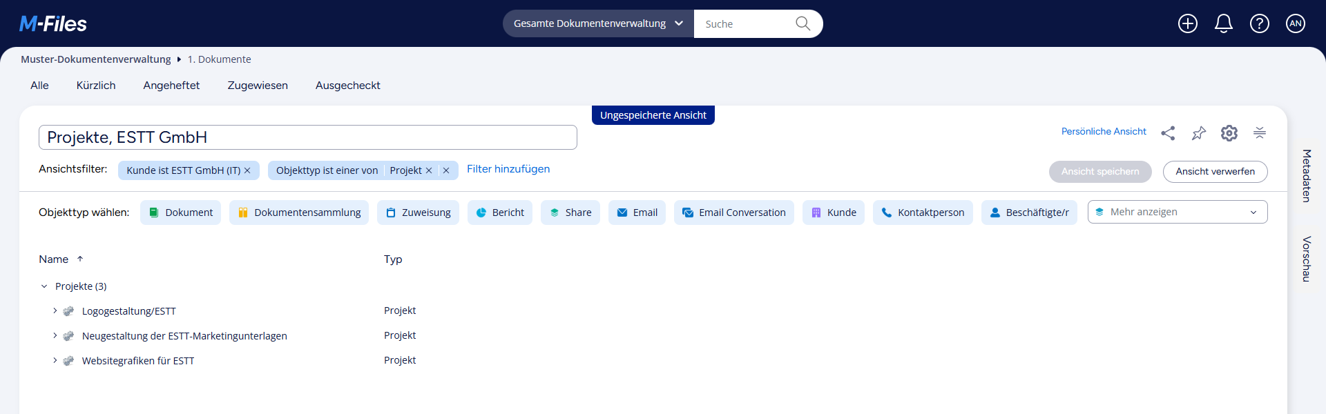 Hinweis: Das Beispiel wird mit der M-Files Muster-Dokumentenverwaltung erstellt. Es kann sein, dass Ihre M-Files Dokumentenverwaltung eine andere Struktur und einen anderen Inhalt hat.