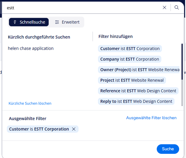 M-Files schlägt Ihnen automatisch Suchfilter vor, wenn Sie einen Suchbegriff in die Suchleiste eingeben.
