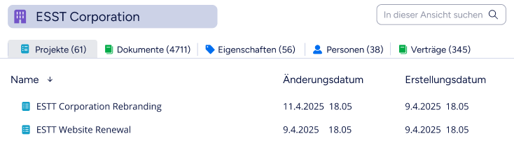 Ein Arbeitsbereich zeigt alle Inhalte an, die sich auf ein Objekt beziehen, zum Beispiel einen Kunden. Sie können einen Arbeitsbereich für ein Kundenobjekt öffnen, um alles, was damit verbunden ist, z. B. Projekte, Dokumente und Verträge, als Registerkarten anzuzeigen.