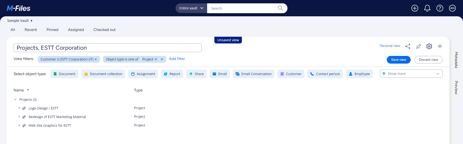 This example tells you how to create a view that contains all projects related to a specific customer. In addition to the project details, the view contains information about documents and contact persons related to those projects.