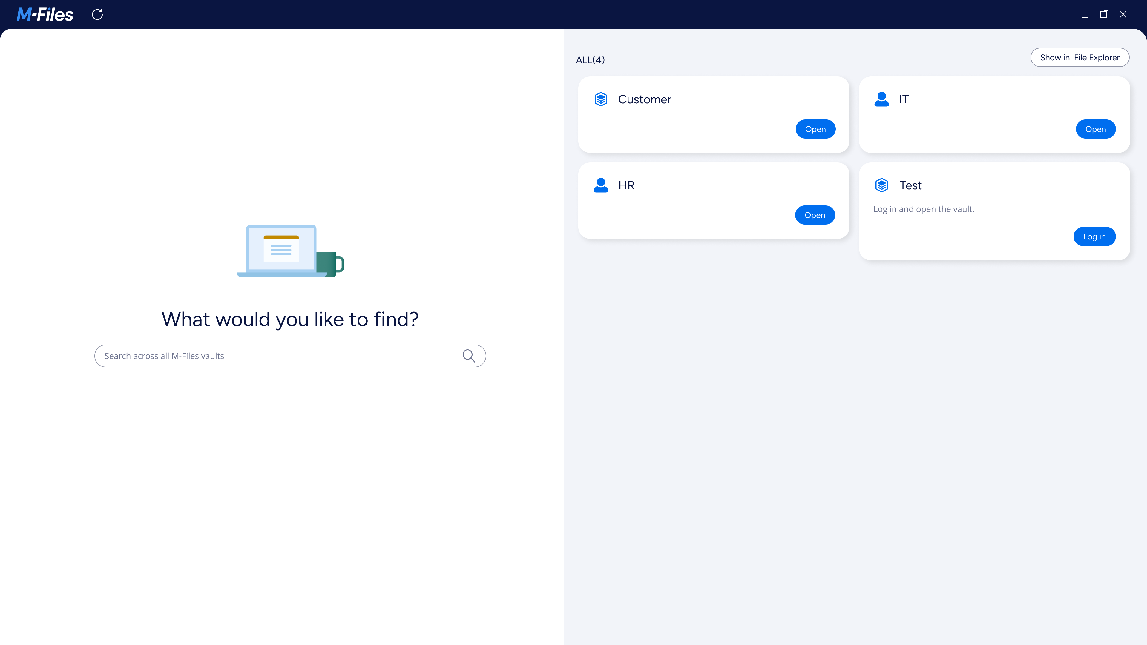 The Home screen has two parts: the search field for Global search is on the left, and the vaults you have access to are on the right. If you are logged in to the vault, you can open it. If you are not logged in, you can log in and then open the vault. Select Show in File Explorer to open the M-Files drive in Windows File Explorer and see the vaults in a folder structure.