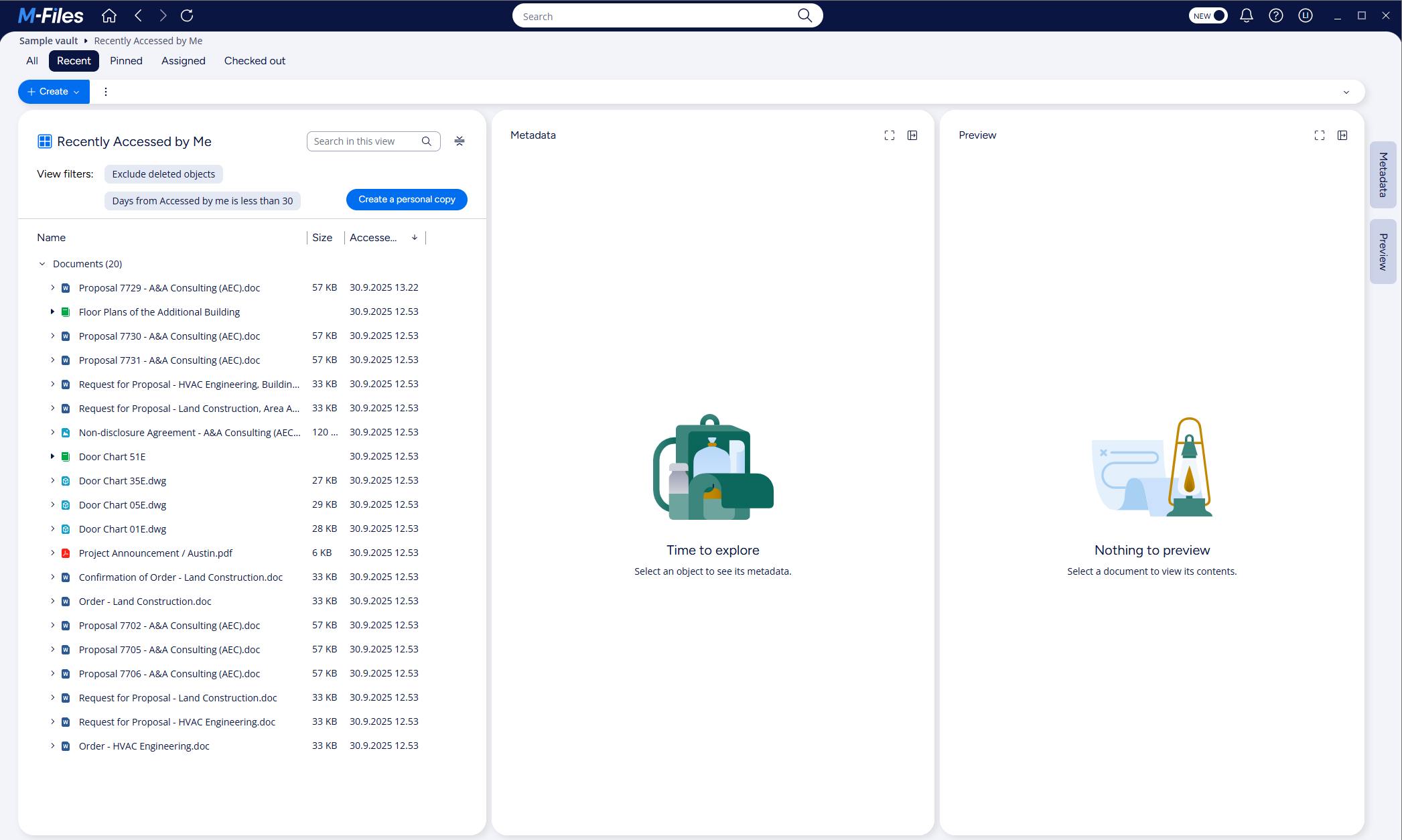 When you select a document in the listing area, M-Files shows a preview of the document, unless the preview area is closed. Also, if the file is too large, M-Files cannot show a preview. Use the options at the top of the area to control the preview. For example, you can zoom in and out, do a search, enter the full screen mode, change between dark and light modes, and download or print content.
